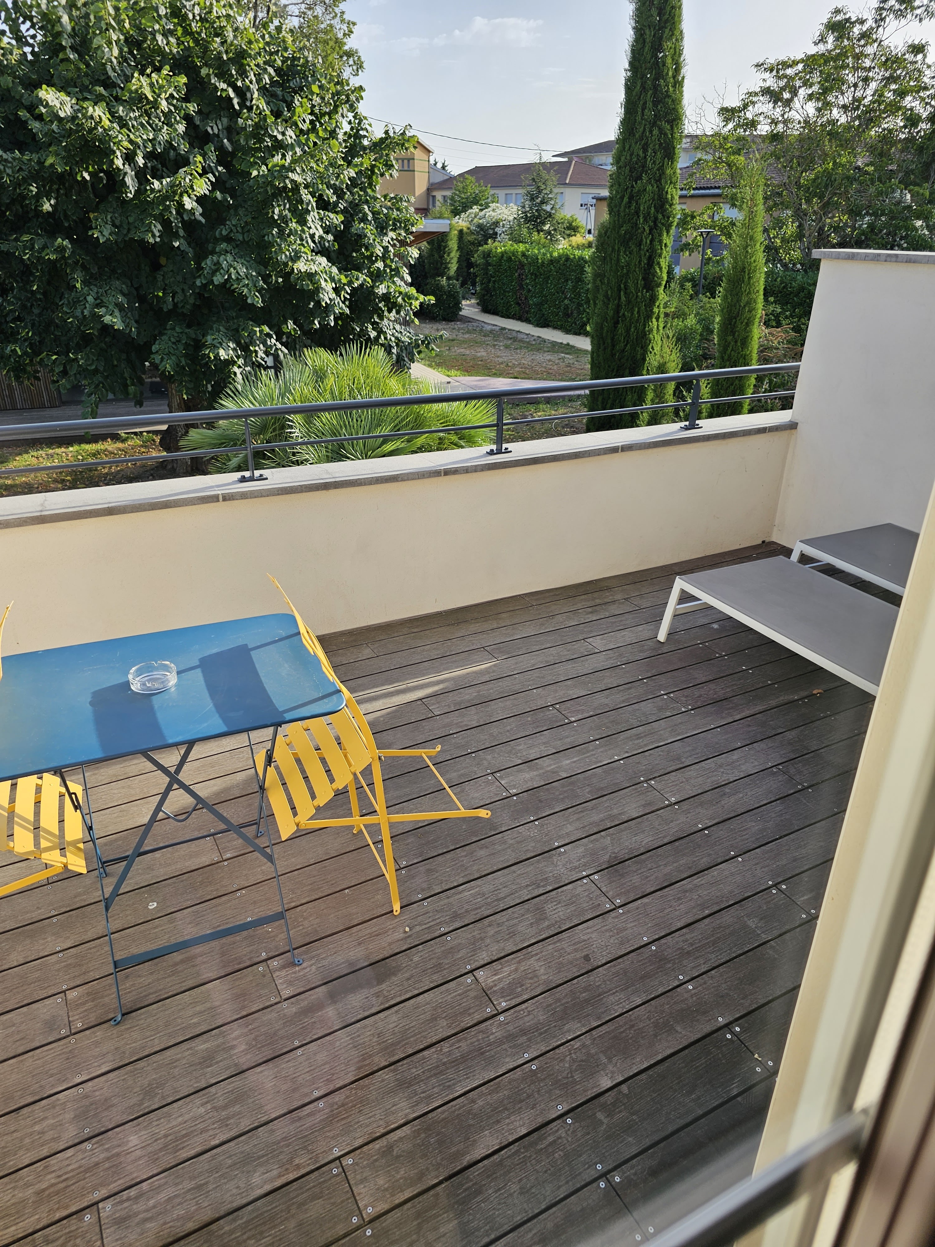 Appartement en duplex spacieux pour 5 personnes avec un chien. Il y a la climatisation qui est très appréciable durant les fortes chaleurs. Seul bémol : le jardin est commun avec les voisins et la térasse est séparée par un simple petit muret, ce qui n'offre pas une vraie intimité lorsqu'on voit les voisins passer à 1m de la table de notre térasse ... La piscine est propre et spacieuse. Petit problème de gestion de la part de l'accueil car l'état des lieux au départ des précédents locataires n'a pas dû être fait car il manquait beaucoup de vaisselle et d'ustensiles. Bon séjour dans la périphérie de Toulouse. Voiture ou transport en commun nécessaire pour rejoindre le centre.