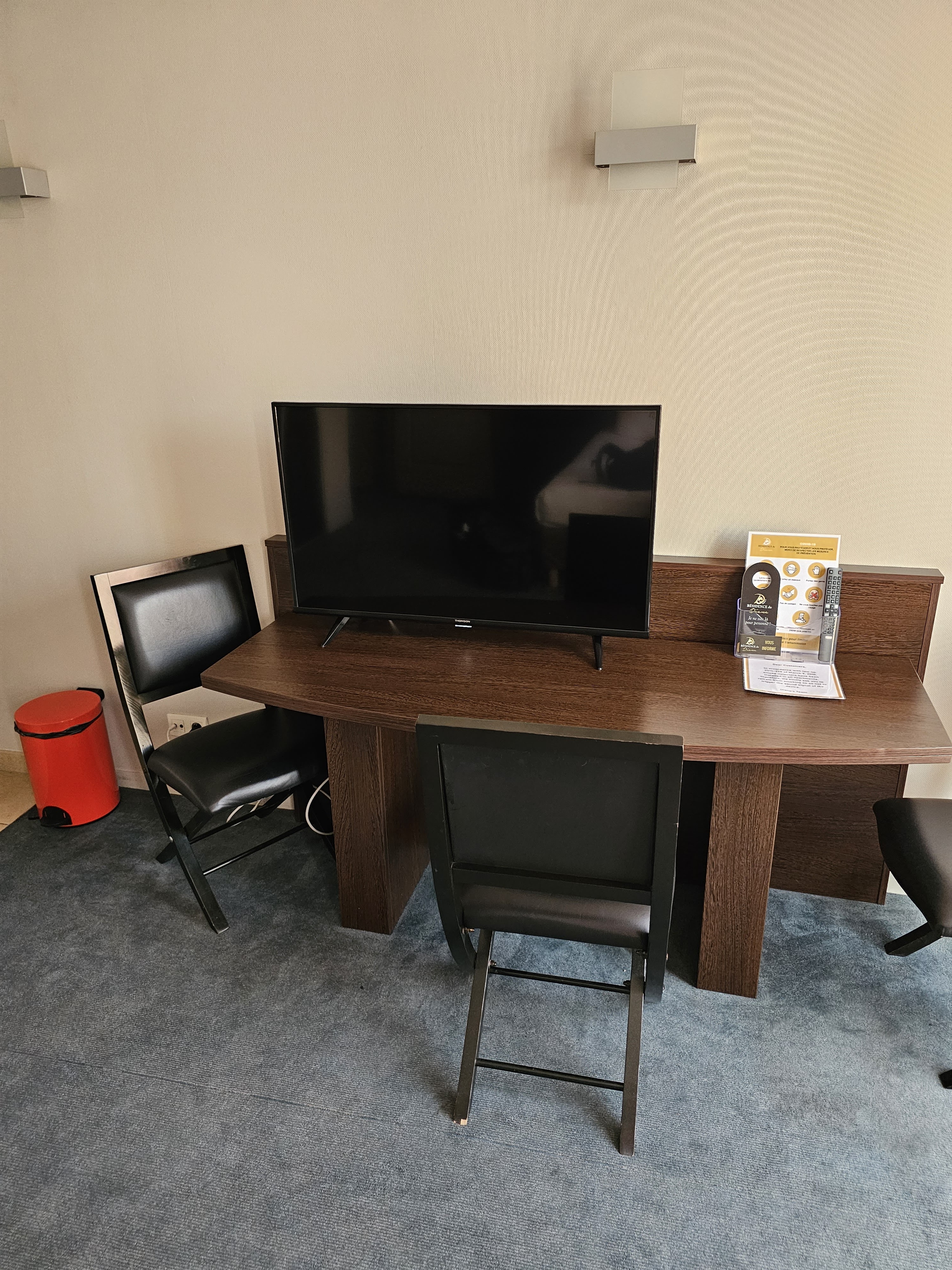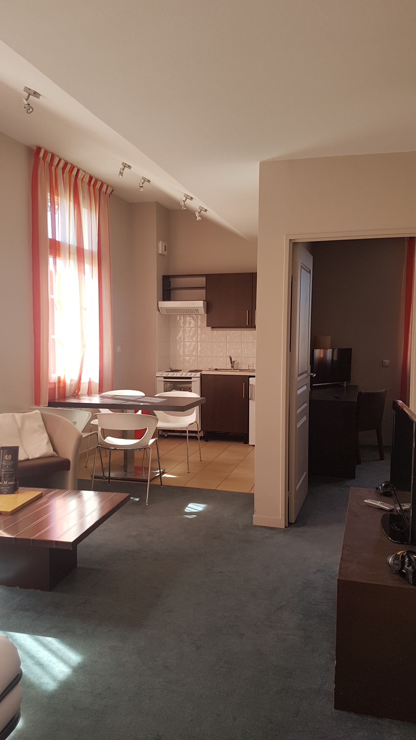 Hotel imposé par mon agence de voyage à 122€ PdJ compris. La chambre est confortable mais lorsque vous allez à l'hôtel ca peut surprendre de trouver une cuisine dans la chambre à coucher: pas trop adapté pour un déplacement professionnel d'une nuit ou 2. Le lit est très confortable et c'est calme. A noter, pas de savon dans la douche, recharge vide et c'est pas évident de manger dans le quartier, petite guinguette à pizza à 2 pas (sympa) et restauration de centre commercial en face, une brasserie â 7 minutes à pied mais refusé de me servir car surbooké. Je reviendrais quand même si c'est mon employeur qui paye...